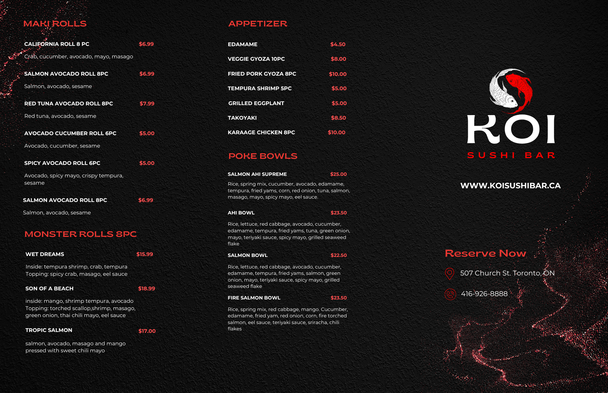 We conceptualized and executed Koi Sushi’s full brand ecosystem. From logo and visual identity to menus, signage, and packaging, every detail was designed to create a memorable and consistent experience. A sleek, responsive website was developed to showcase their offerings, integrate online reservations, and reflect the restaurant’s refined aesthetic. The result is a brand that feels authentic, modern, and inviting—positioning Koi Sushi as not just a place to eat, but a destination for an elevated dining experience.