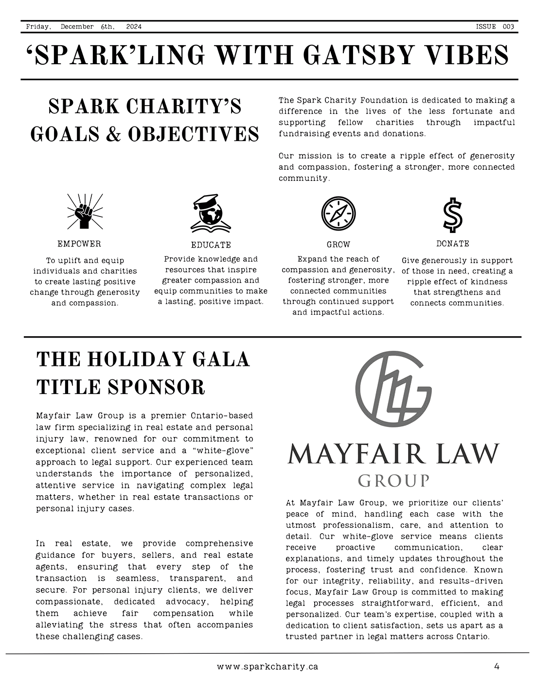Graphic design elements for this project involved the creation of a presentation deck and event program. The choice of styling with respect to theme, accents, fonts, and colours was to follow a classy, “Great Gatsby” style. To add authenticity to the feel and theme of the event, the event program was designed as a 1920s-style newspaper entirely in black-and-white,